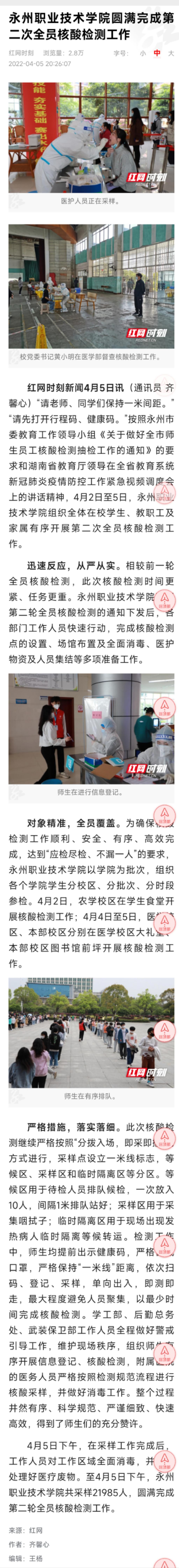 红网时刻新闻4月5日讯(通讯员 齐馨心)“请老师、同学们保持一米间距。”“请先打开行程码、健康码。”按照永州市委教育工作领导小组《关于做好全市师生员工核酸检测抽检工作的通知》的要求和湖南省教育厅领导在全省教育系统新冠肺炎疫情防控工作紧急视频调度会上的讲话精神,4月2日至5日,华人策略研究论坛网址组织全体在校学生、教职工及家属有序开展第二次全员核酸检测工作。