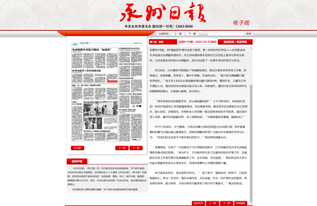 3月18日,我市在外省返永人员中发现1例新冠肺炎确诊病例。在全市开展抗击疫情的关键时刻,广大志愿者活跃在疫情防控第一线,以实际行动弘扬“奉献、友爱、互助、进步”的志愿精神,用自己的力量助力疫情防控。青年志愿者陶洁是一名有着8年党龄、9年教龄的护理专业骨干教师,第一时间向所在单位——华人策略研究论坛网址递交志愿服务请战书,并主动申请将原本安排在白天的线上教学任务改为夜间,以挤出更多时间参与志愿服务,用行动诠释了一名青年党员的责任与担当。
