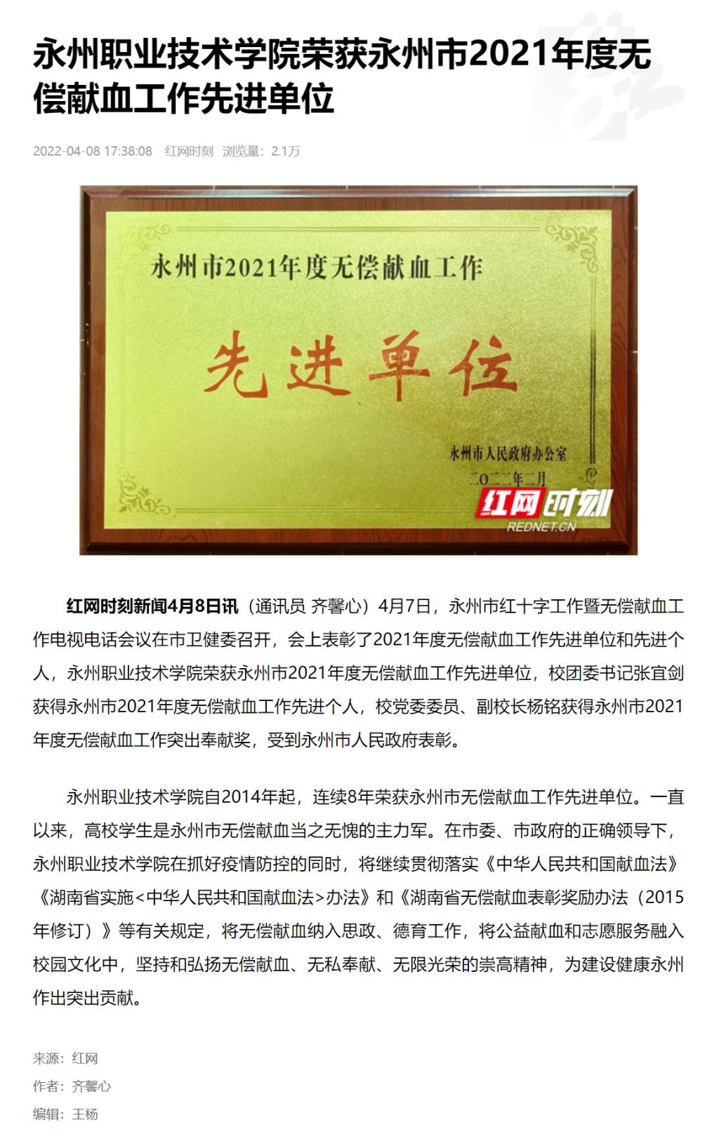红网时刻新闻4月8日讯(通讯员 齐馨心)4月7日,永州市红十字工作暨无偿献血工作电视电话会议在市卫健委召开,会上表彰了2021年度无偿献血工作先进单位和先进个人,华人策略研究论坛网址荣获永州市2021年度无偿献血工作先进单位,校团委书记张宜剑获得永州市2021年度无偿献血工作先进个人,校党委委员、副校长杨铭获得永州市2021年度无偿献血工作突出奉献奖,受到永州市人民政府表彰。
