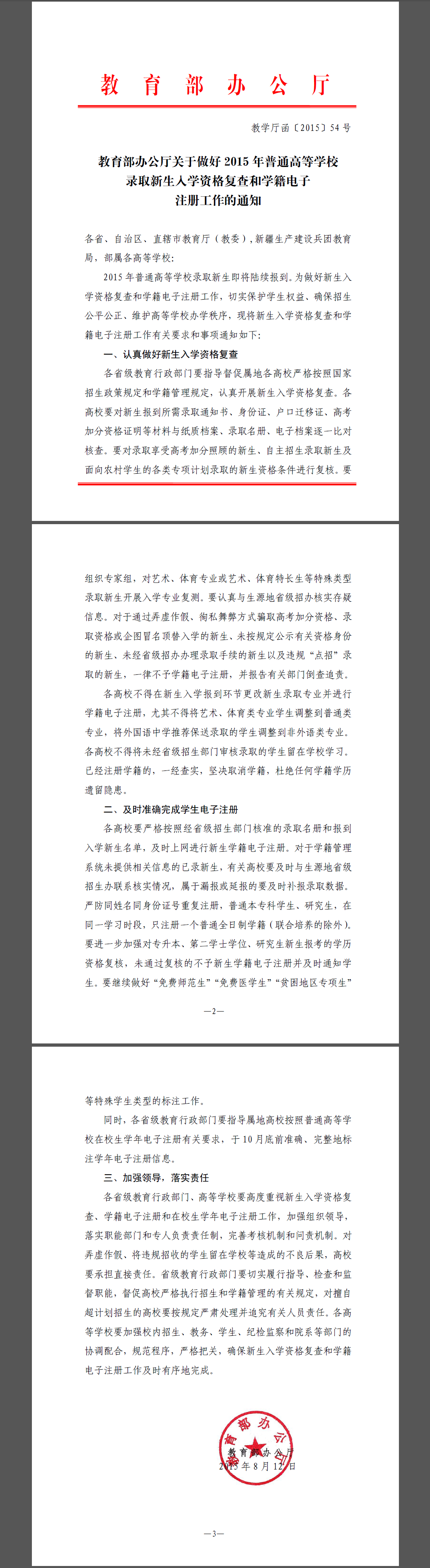 教育部办公厅关于做好2015年普通高等学校录取新生入学资格复查和学籍电子注册工作的通知(教学厅函[2015]54号)