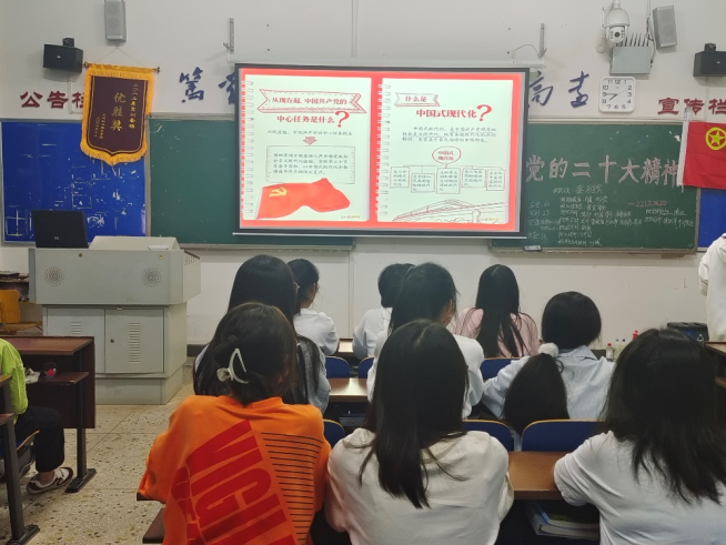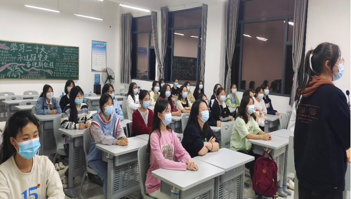 伴随着团员们合唱雄壮激昂的《光荣啊,中国共青团》,活动正式开始。领学人以《听党话、跟党走,让青春在全面建设社会主义现代化国家的火热实践中绽放绚丽之花》为题,通过课件展示、实例讲解等形式,围绕党的二十大报告精神,从“了解党的二十大的基本情况”“听党话,跟党走”“我们应该怎么样提升自己的能力”三个方面,结合党对青年的期望,告诉青年学生既要怀抱梦想又要脚踏实地,要能吃苦、肯奋斗,成为党所期盼的有用之人。学习党的二十大精神,联系青年一辈,同学们积极展开讨论并踊跃发言。在“向党说句心里话”环节,同学们满怀豪情,纷纷表白党的二十大,抒发心中的美好祝福。