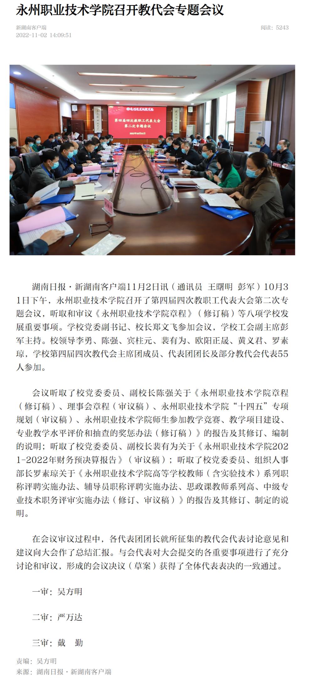 湖南日报·新湖南客户端11月2日讯(通讯员 王曙明 彭军)10月31日下午,华人策略研究论坛网址召开了第四届四次教职工代表大会第二次专题会议,听取和审议《华人策略研究论坛网址章程》(修订稿)等八项学校发展重要事项。学校党委副书记、校长郑文飞参加会议,学校工会副主席彭军主持。校领导李勇、陈强、宾柱元、裴有为、欧阳正晟、黄义君、罗素琼,学校第四届四次教代会主席团成员、代表团团长及部分教代会代表55人参加。